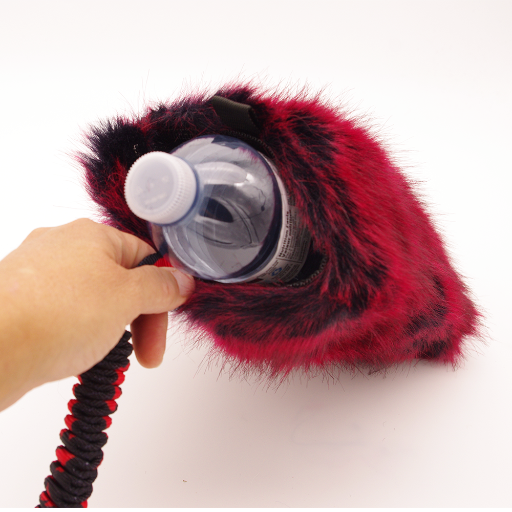 The Bottle Tug consists of a heavy nylon-reinforced pocket with a short bungee handle - perfectly sized for an average plastic water bottle. These tugs are great for dogs, like our LeGuin, who love to feel that satisfying CRUNCH when they bite a tug.