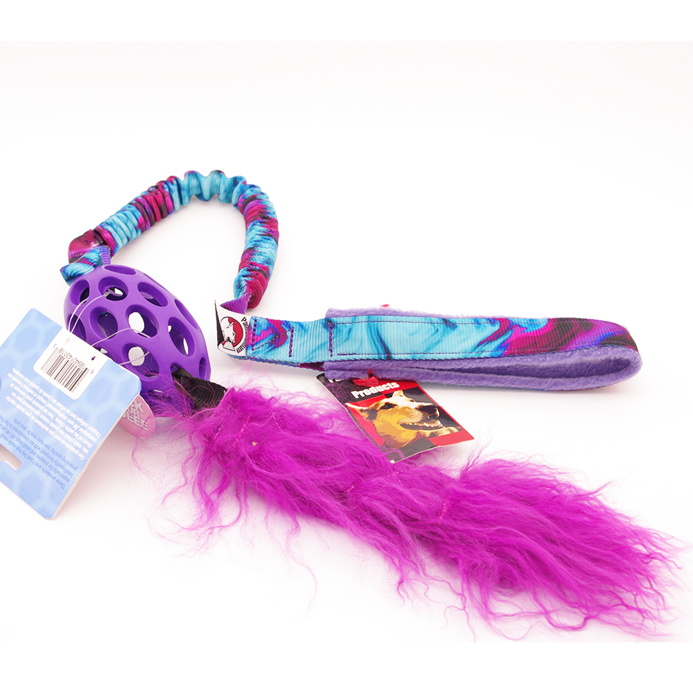 This longer tug toy comes with 5 inches of bungee on a long handle with a Small Holee Football and a Tibetan Lamb "tail" - it's perfect for dogs who love to chase their prey!