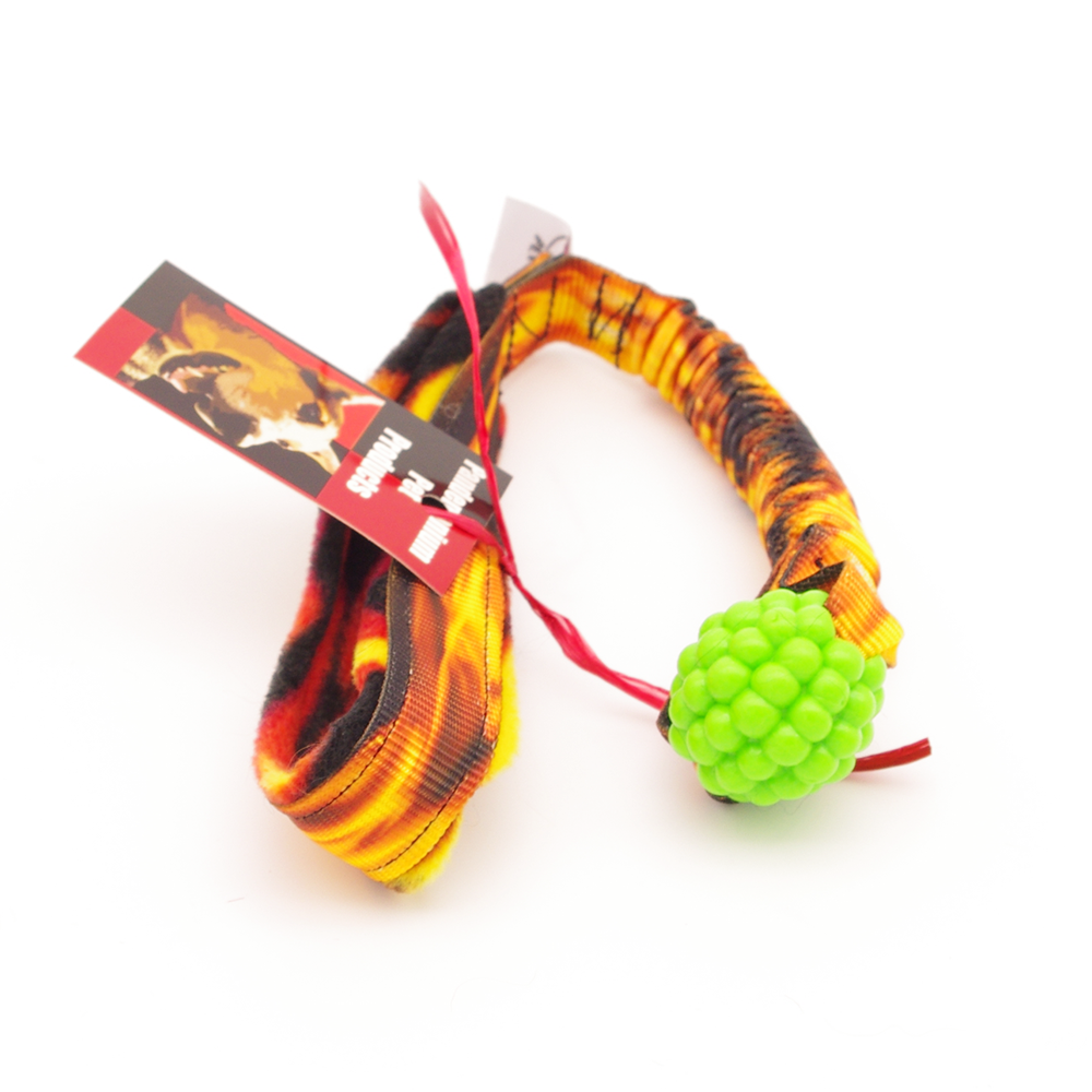 Our smallest ball on a nice short tug (approximately 15 inches long), perfect for tugging with a small dog and easy to hide in your pocket.
