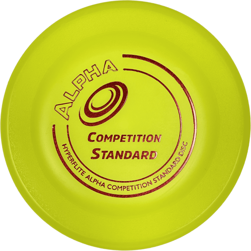 Hyperflite Alpha Competition Standard discs are 10″ in diameter, weighing in at 150 grams. Available initially in Competition Standard formulation, yellow color, and shaped like our popular K-10 disc — Alpha Competition Standard discs will feel instantly familiar and comfortable in your suddenly tiny hands. And, for big-time competitors, naturally, the Alpha Competition Standard disc is approved for all Skyhoundz competitions.