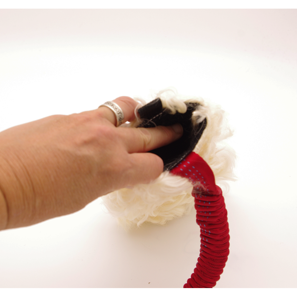 This tug is an adaptation of our beloved "Lamby Lunger" tug - and consists of the regular curly lamb over a nylon core section for biting with a small pocket near the handle for hiding food rewards! This interactive tug toy comes with a "classic" length bungee (8 inches) and a fleece lined handle.