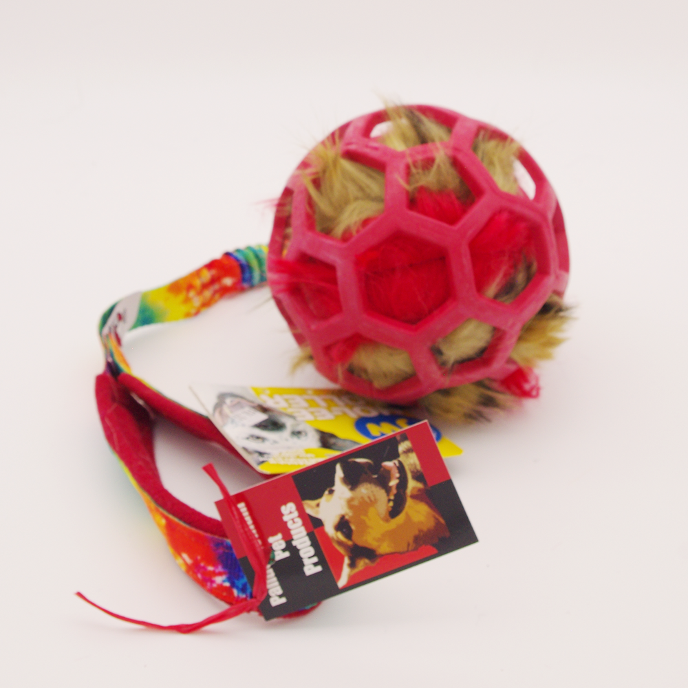 These large-sized holee rollers are stuffed with our Smelly Balls (lined faux fur stuffed with unwashed sheared wool), and come with a shorty bungee and fleece-lined handle - while not overly evident to humans, the smell is definitely attractive to dogs (especially the herding breeds!)