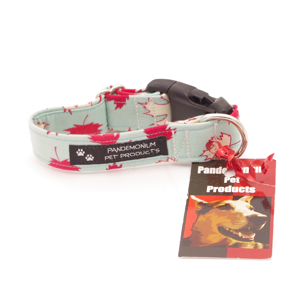 Our fabric flat-buckle collars are all hand-made in Canada with cotton fabric and nylon core.