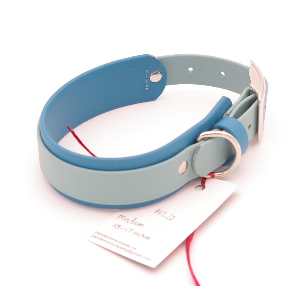 BioThane ® is the registered brand name of a US company that applies TPU or PVC coating to polyester webbing to create a variety of durable and waterproof products. Unlike imitation brands, BioThane® stands up well to the test of time. In 2020 Pandemonium Pets made the shift from working in leather to working in biothane as we were impressed with the variety and longevity of the material.