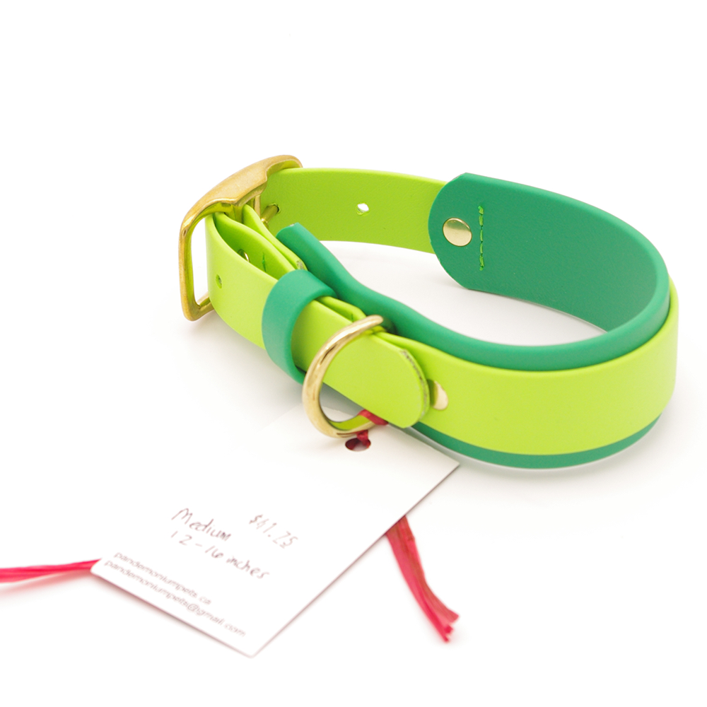 This 1.5 inch wide Emerald and Lime green collar fits 12 - 16 inch necks and is finished with brass hardware