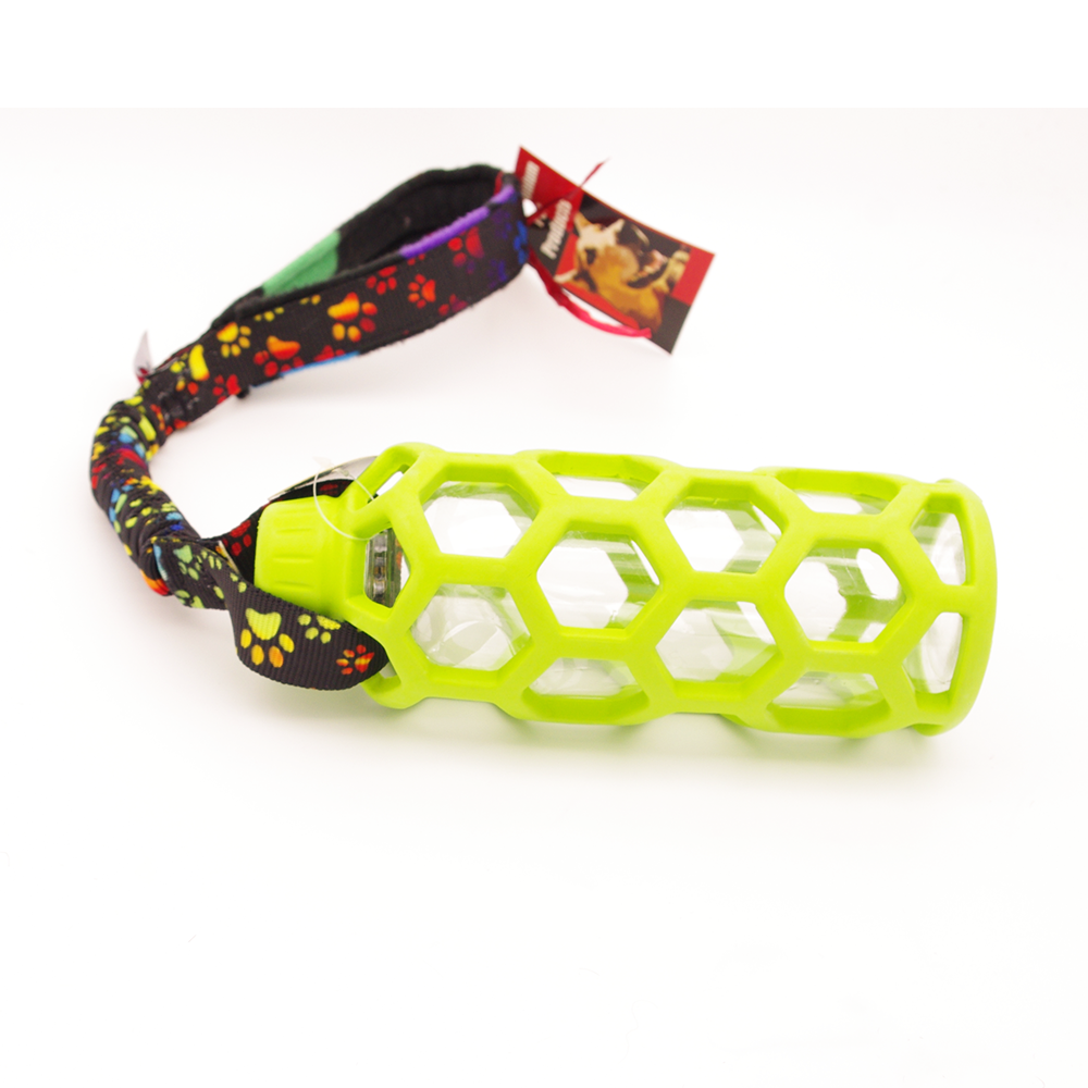 Holee Brand Bottle crunch toy on the end of a short bungee line - ideal for strong biting dogs who love the CRUNCH!