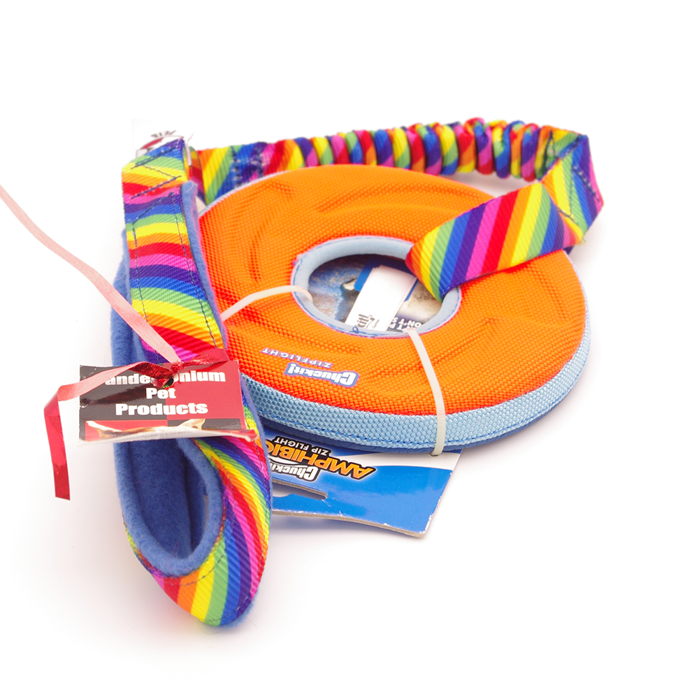 This tug blends the floating fun of a Chuck It Zip Flight disc with a short bungee handle.