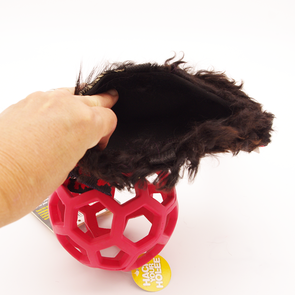 This toy combines the fun of a small holee roller with a curly lamb treat pouch for a cuff. Ideal for dogs who are just learning to tug, but still love their food reinforcers!